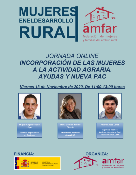 La Federación de Mujeres y Familias del Ámbito Rural (AMFAR), informará mañana viernes, 13 de noviembre, sobre las ayudas a la que pueden optar las mujeres que se incorporen a la actividad agraria y sobre la nueva PAC, en una jornada telemática que tendrá lugar de 11 a 13 horas, a través de la plataforma zoom.