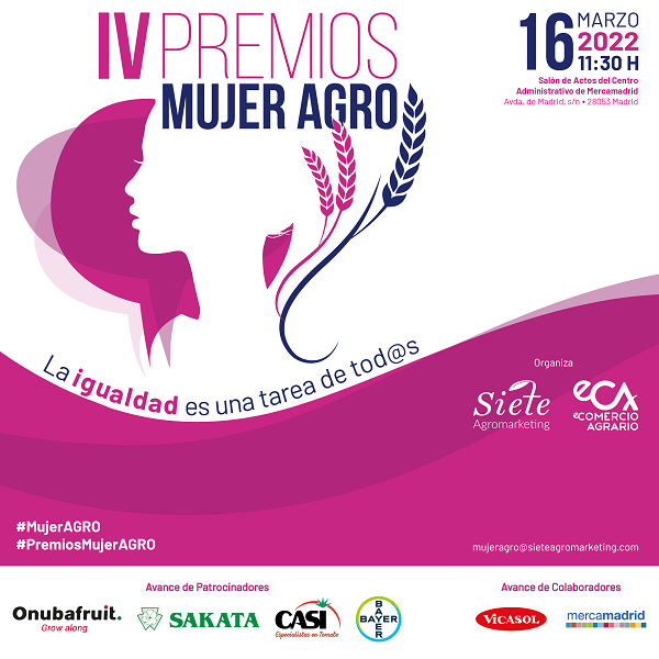 El próximo 16 de marzo, tendrá lugar desde Mercamadrid, la ceremonia de Entrega de los IV Premios Mujer AGRO, y lo hace con el apoyo y patrocinio de CASI, Bayer, Onubafruit y Sakata, y la colaboración de Vicasol y Mercamadrid, en un acto además que estará precedido por una Tertulia que nos avanzará las claves para crear Planes de Igualdad en el sector agroalimentario.