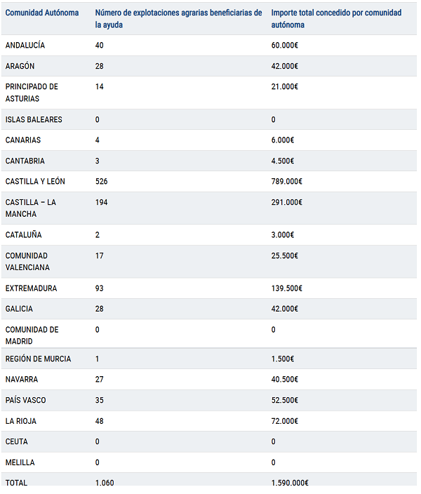En la siguiente tabla se recogen los datos de las explotaciones beneficiarias, las cuantías de las ayudas y su distribución por comunidades autónomas.
