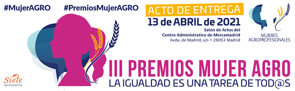 Siete Agromarketing y eComercio Agrario harán entrega de los III Premios Mujer AGRO (#mujerAGRO/www.mujeragro.es) mañana día 13 de abril en Madrid, en un acto híbrido: presencial bajo invitación y con todas las medidas de seguridad; y online con retrasmisión en directo a través del canal de Youtube de Siete Agromarketing, y con una amplia cobertura en los diferentes perfiles en Redes Sociales de Siete Agromarketing, eComercio Agrario y MujerAGRO.